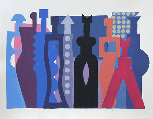 Aus Holzabfällen werden Druckformen gesägt und vielfarbig gedruckt –nebeneinander und übereinander. Jede Arbeit ist ein Unikat. Als Spiel entsteht eine neue Bildsprache.